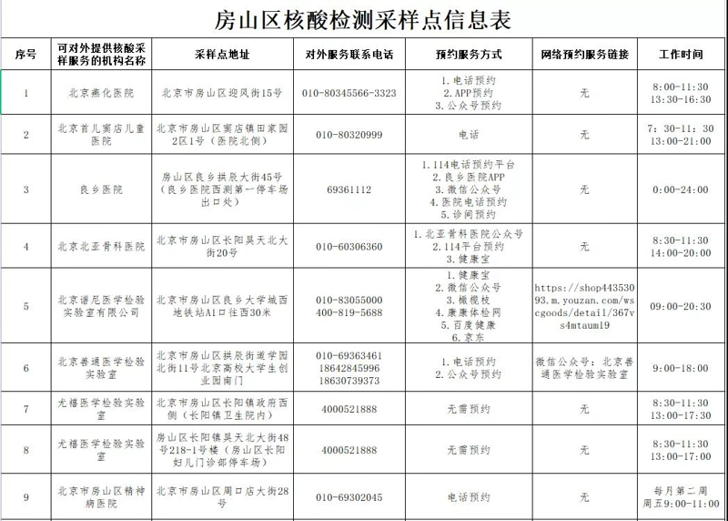 方興君提示您,當(dāng)前房山區(qū)核酸檢測(cè)采樣點(diǎn)信息有更新,現(xiàn)整理出來(lái),供各位建房業(yè)主參考。